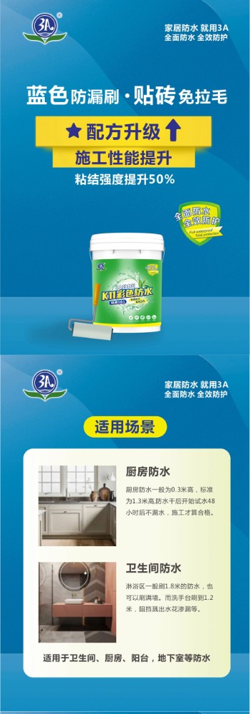 3A封水宝K11彩色防水经典5合1是一种双组份水性防水浆料,采用优质聚合物乳液,以特种水泥和优质填料组成无机粉料,经一定比例配制而成,搅拌后形成浆料。产品具有良好的耐水性、耐碱性、粘结强度高等特性,粉体细腻、施工流平性好,有效避免漏涂。粘结强度高,可用于背水面防水施工,可在无明水的潮湿基面上直接施工。